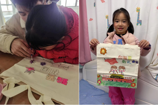 在紅色情懷的感召下,家長帶領(lǐng)著孩子們提起畫筆,在帆布袋上盡情創(chuàng)作,鮮艷的五星紅旗、閃閃的紅星,他們用繪畫這種獨特方式抒發(fā)出對英雄人物、紅色故事、祖國和黨的熱愛之情。在小朋友們筆下,原本簡單的白色帆布袋被點綴一新,每一幅圖畫都色彩鮮艷、形象逼真。小朋友們也拿著畫好的帆布袋進行合照打卡,臉上洋溢著開心滿足的笑容。