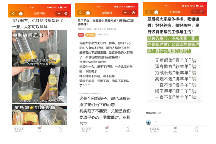 居民在線上聊一聊“你陽了嗎?”、看一看“如何食療減輕癥狀”,為居民提供了線上心理舒壓的平臺,大家紛紛在留言區(qū)暢所欲言,說說自己的癥狀、討論下如何用藥。有人家中缺藥了,還有愛心居民自告奮勇:“我家有,給你用,不要錢!”各種暖心舉動不勝枚舉。居民趙女士表示:特殊時期的線上溝通很有必要,能讓大家暢所欲言、排解壓力,也使得社區(qū)服務(wù)更加貼心。