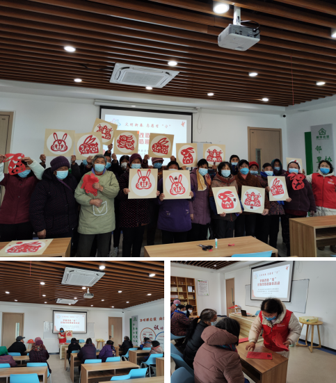 活動(dòng)尾聲,老人們小心翼翼地把精美的窗花兔子貼在了裁剪整齊的廢紙板,大家相互展示自己的成品。李阿姨的兔子窗花獲得了周圍老人的稱贊,紅艷艷的剪紙窗花營造出濃濃的年味。