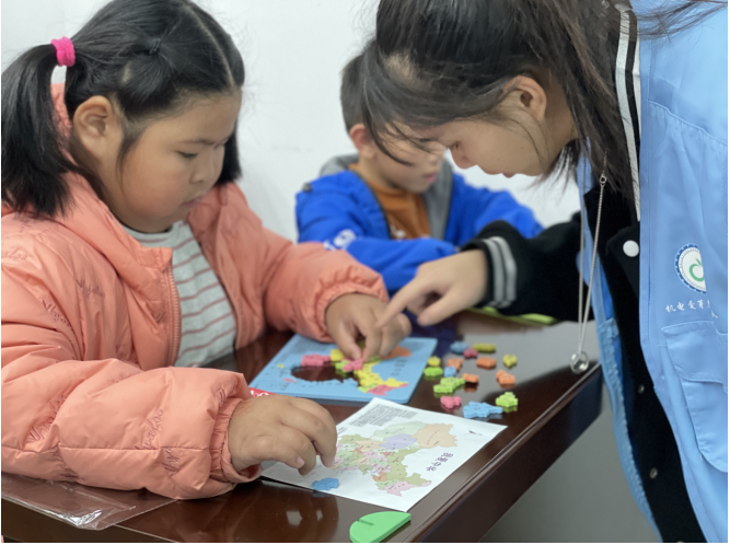 閱讀開始后,首先,志愿者借助PPT演示,從中國版圖輪廓入手,按部位首先為孩子們講授了各省份的分布、形狀、人文特色等知識,并通過提問互動的方式,如“你知道我們所在的省份是哪里么?”、“你能認(rèn)識上海市么?”、“知道自己家鄉(xiāng)的特色美食么?”等,幫助同學(xué)們對祖國有了比較全面、系統(tǒng)的了解。隨后,拼圖環(huán)節(jié),孩子們按照自己的記憶和志愿者的助力,認(rèn)真完成著每個省份的拼圖,進(jìn)一步加深了孩子們對祖國的認(rèn)知。