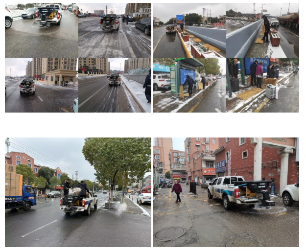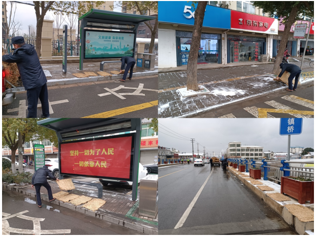 根據(jù)市區(qū)指揮部工作要求以及實(shí)時(shí)雪情變化,組織中隊(duì)強(qiáng)化夜間巡查值守,對(duì)集鎮(zhèn)主干道路、橋梁路面等處不間斷散播融雪劑,以防路面積雪結(jié)冰。同時(shí)進(jìn)一步加大集鎮(zhèn)區(qū)域車(chē)巡步查頻次,在公交站臺(tái)、橋梁人形道上鋪設(shè)草墊防滑,引導(dǎo)沿街商戶(hù)落實(shí)門(mén)前三包、清掃門(mén)前積雪,多舉措保通暢。