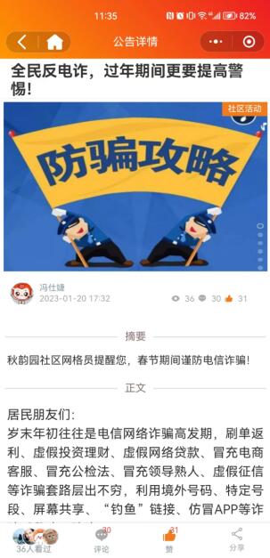 為了提高居民的反電詐意識(shí),預(yù)防和減少電信詐騙案件的發(fā)生,過(guò)好平安祥和年,南京市棲霞區(qū)邁皋橋街道秋韻園社區(qū)充分發(fā)揮“掌上社區(qū)”的高覆蓋和時(shí)效性,通過(guò)掌上云平臺(tái)“社區(qū)公告欄”模塊發(fā)布“全民反電詐,過(guò)年期間更要提高警惕”,加強(qiáng)防范詐騙宣傳教育,構(gòu)建和諧的家庭環(huán)境和社區(qū)環(huán)境。