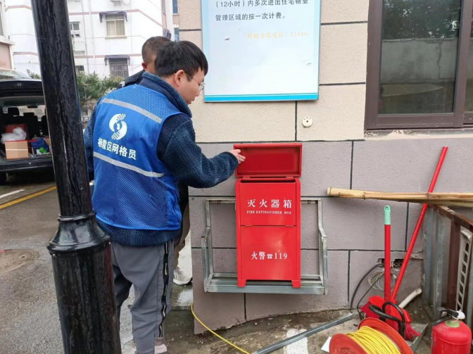 檢查過程中,社區(qū)安全員對小區(qū)內(nèi)滅火器是否過期、放置是否合理、罐體是否變形或損傷、噴口是否堵塞等情況進(jìn)行逐一排查,并對不合格滅火器進(jìn)行更換和補(bǔ)充,確保了消防器材的完好、有效,最大限度消除火災(zāi)隱患??紤]到部分消防設(shè)施不完善,社區(qū)安全員還特地安裝了專門的滅火器箱,改善滅火器的存放條件,延長滅火器的使用時效。