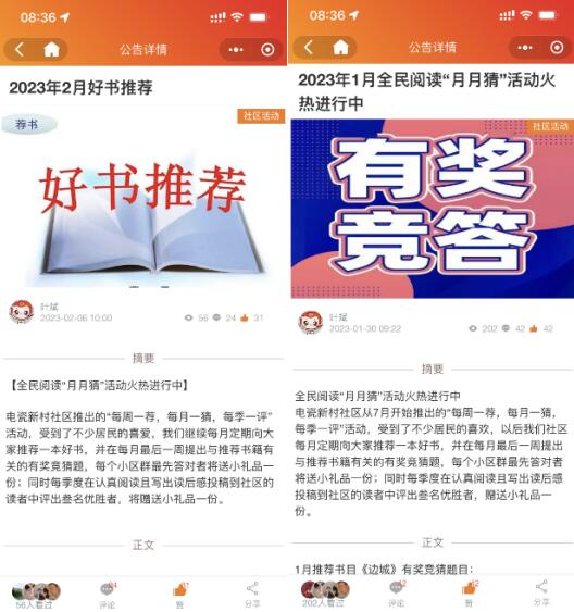 活動每月定期向大家推薦一本好書,包含黨史教育、詩歌、散文、名人名著等書籍,組織大家線上交流書中的內(nèi)容和自己的心得體會,分享讀書感悟,并在每月最后一周提出與推薦書籍有關的有獎競猜題,每個小區(qū)群最先答對者將送出小禮品一份;同時每季度在認真閱讀且寫出讀后感投稿到社區(qū)的讀者中評出三名優(yōu)勝者,贈送獎品,活動內(nèi)容豐富多彩,福利多多,受到了不少居民的喜愛。