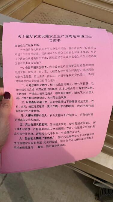 活動(dòng)中,社區(qū)網(wǎng)格員利用標(biāo)語(yǔ)、廣播、微信等形式加強(qiáng)農(nóng)業(yè)設(shè)施安全知識(shí)宣傳,并發(fā)放《關(guān)于做好農(nóng)業(yè)設(shè)施安全生產(chǎn)及周邊環(huán)境衛(wèi)生告知書(shū)》,從“全面開(kāi)展安全檢查”、“杜絕使用明火燃?xì)?rdquo;、“時(shí)刻做好環(huán)境衛(wèi)生”、“大棚內(nèi)禁止住人”、“安全使用農(nóng)藥化肥”、“堅(jiān)決制止耕地‘非農(nóng)化’”六個(gè)方面逐一講解,帶領(lǐng)居民共同了解安全生產(chǎn)法律法規(guī)、日常安全知識(shí),倡導(dǎo)大家不斷增強(qiáng)安全生產(chǎn)意識(shí),切實(shí)保護(hù)自身生命財(cái)產(chǎn)安全。