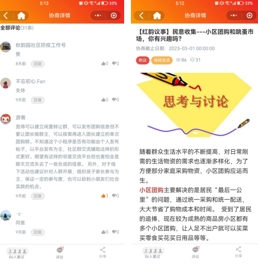 近日,南京市棲霞區(qū)邁皋橋街道秋韻園社區(qū)在掌上云“協(xié)商議事”板塊發(fā)布“紅韻議事:民意收集——小區(qū)團(tuán)購(gòu)和跳蚤市場(chǎng),你有興趣嗎?”一文,吸引了很多居民評(píng)論出點(diǎn)子,為社區(qū)“智”治賦能。