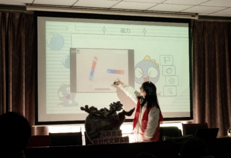 寒潮襲空,九九將逝。穿越寒風,跨越長路,南師大物科院“向心力”志協(xié)的大學生志愿者領(lǐng)隊馬芷涵同學受邀擔任本次活動的講師,帶領(lǐng)著物理科學與技術(shù)學院2102H班級的志愿者們,為棲霞區(qū)馬群街道果場社區(qū)新時代文明實踐站的未成年人們?nèi)计鹆丝茖W的篝火。