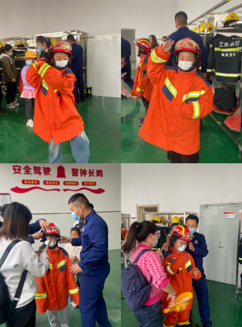 隨后,在消防員的專業(yè)講解下,大家對(duì)消防滅火常用的器材裝備進(jìn)行了全方位的學(xué)習(xí),如滅火器、消防員的衣服、靴子、頭盔等,還對(duì)如何接消防栓,水帶等進(jìn)行了學(xué)習(xí)。在身著消防員衣服、裝備來切身體驗(yàn)后,大家對(duì)消防員頂著沉重裝備還要進(jìn)行救人滅火作業(yè)的專業(yè)能力感到敬佩,紛紛贊揚(yáng)消防員叔叔們的頑強(qiáng)意志和專業(yè)技能。