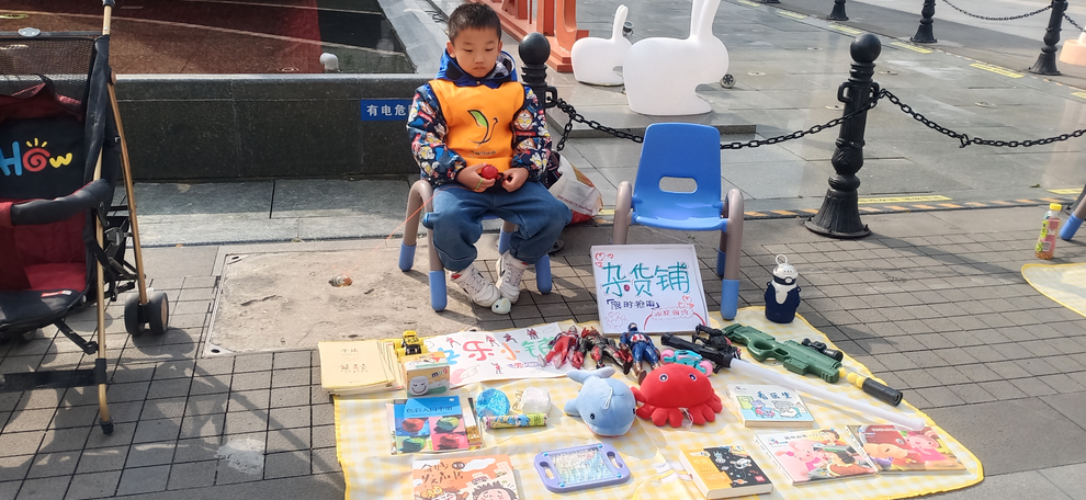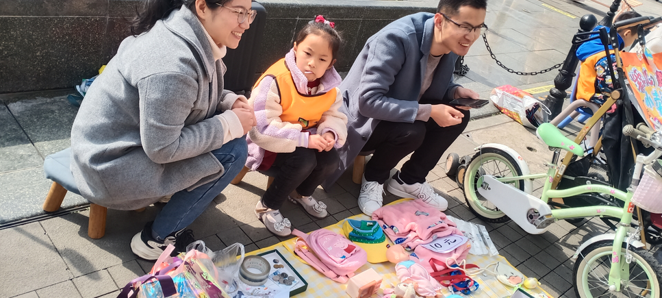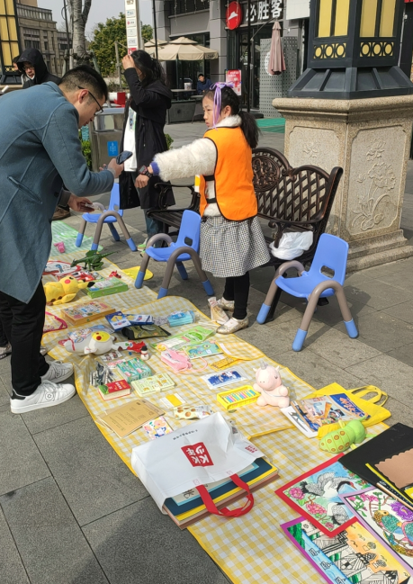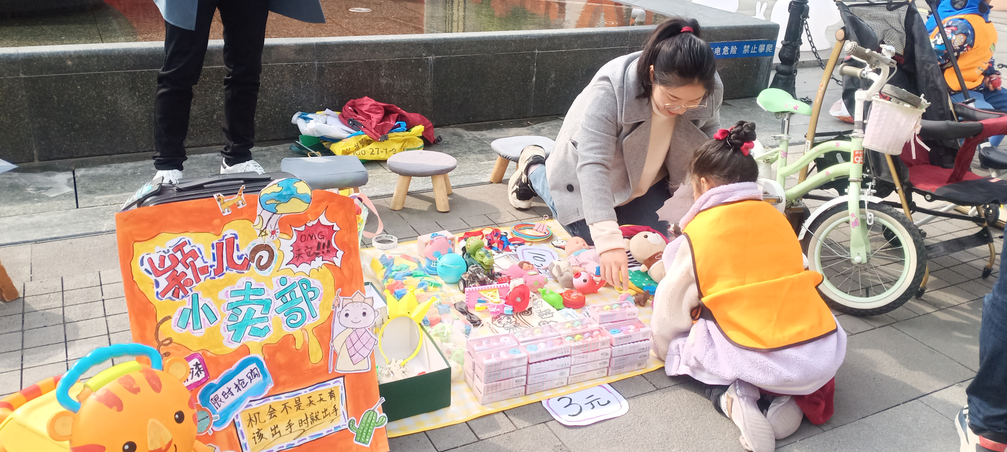 活動現(xiàn)場,孩子和家長們挑選出家中品相較好的閑置玩具、書本、文具、手工DIY等物品,家長們先將物品進(jìn)行簡單分類定價,制作成價目表給每個物品定好標(biāo)簽,接著“小老板們”各顯神通,通過手繪或打印的方式,制作出一個個吸引眼球的精致宣傳板,并用彩帶裝飾自己的店鋪,經(jīng)過一上午的宣傳擺攤,每個攤位都收獲滿滿,每一個孩子都充滿了自豪感。