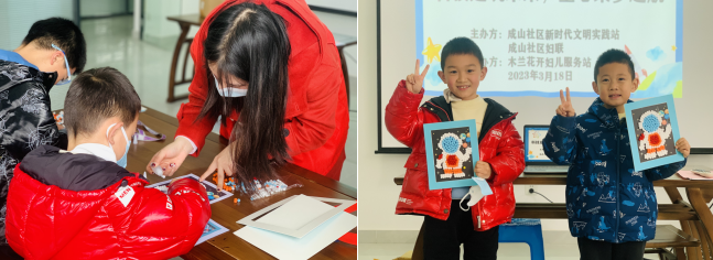 在宇航員和火箭的粘貼畫環(huán)節(jié),志愿者先耐心的向孩子們講解了粘貼畫的步驟和技巧,以及粘貼過程中要注意的大小毛球的排列組合和膠水的涂抹位置等問題。隨著志愿者的講解,孩子們興致勃勃的動起手來,在孩子們富有童趣的想象力下,一張張生動可愛的粘貼畫就完成了。