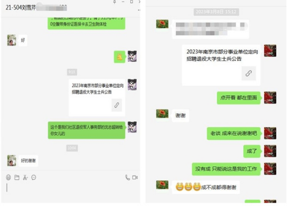三月初,棲霞區(qū)退役局在公眾號上發(fā)布了2023年南京市部分事業(yè)單位定向招聘退役大學生士兵公告,百水家園社區(qū)退役軍人工作站積極響應,對轄區(qū)內(nèi)的符合條件的退役軍人又進行一次梳理,積極的和退役軍人本人聯(lián)系,將這個消息傳遞給他們,對于沒有及聯(lián)系到的退役軍人,百水家園退役軍人工作站也聯(lián)系他們家所在網(wǎng)格的網(wǎng)格員,用微信及時通知他們的家人,將招聘信息和鏈接同時發(fā)送過去,為他們能夠找到自己滿意的工作默默的工作著,這些退役軍人的家屬們,也為百水家園社區(qū)退役軍人工作站紛紛點贊,同時也希望他們家的退役軍人能夠應聘上自己滿意的工作。
