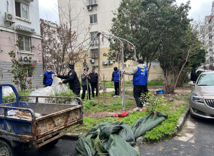 近日,南京市江寧區(qū)淳化街道橋頭社區(qū)網格員在巡查時發(fā)現在潭橋北園有人私搭違建休閑帳篷,且堆積了不少雜物。違建休閑帳篷不僅影響整體環(huán)境,還會造成雨水沖蝕泥濘等環(huán)保安全問題。為了消除隱患,橋頭社區(qū)網格員、城管、物業(yè)及公安在潭橋北園對這處違規(guī)建筑進行了執(zhí)法拆除,并清除了周圍堆放的雜物。