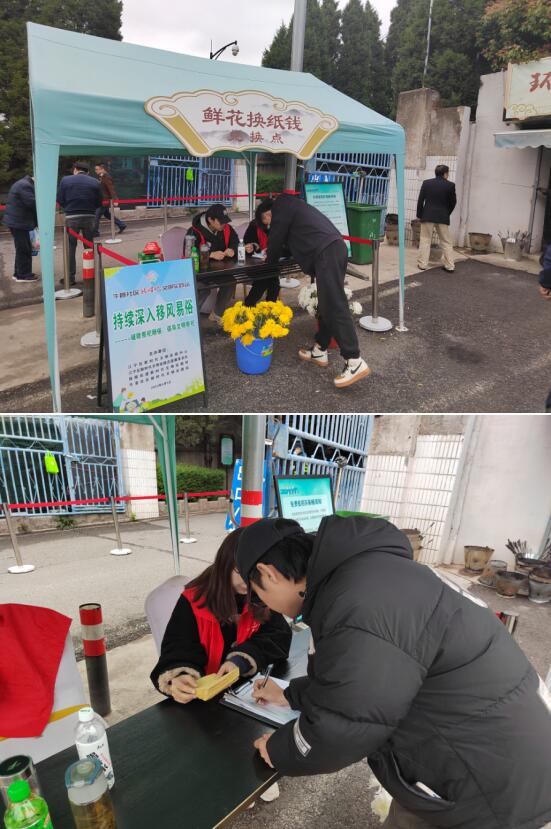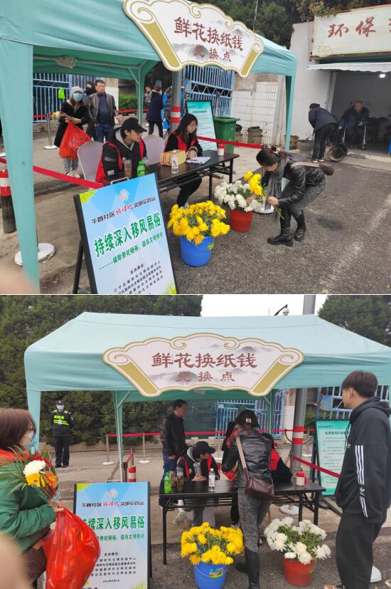 活動(dòng)現(xiàn)場(chǎng),社區(qū)工作人員在隱龍山墓園入口擺放展臺(tái)、張貼文明祭掃宣傳橫幅,設(shè)立“鮮花換紙錢”免費(fèi)兌換點(diǎn),積極宣傳綠色環(huán)保祭祀理念,提倡網(wǎng)上祭奠、親戚代掃、鮮花祭掃等文明祭祀活動(dòng),引導(dǎo)攜帶紙錢祭祀的市民根據(jù)實(shí)際需求,用紙錢免費(fèi)換取鮮花。號(hào)召大家做移風(fēng)易俗的先行者、文明祭祀的帶頭人,積極影響和帶動(dòng)身邊的廣大群眾,對(duì)不文明祭祀行為自覺(jué)抵制、積極勸導(dǎo),以實(shí)際行動(dòng)推動(dòng)移風(fēng)易俗,攜手共度一個(gè)安全、文明、節(jié)儉、綠色的清明節(jié)。