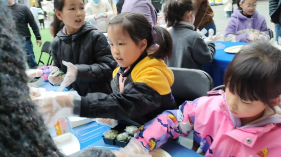 包好后,大家用保鮮膜將青團(tuán)包起來,放進(jìn)了盒子里,最后用準(zhǔn)備好的貼紙將盒子封起來,青團(tuán)就算制作完成啦。完成后,大家拿著自己的成果開心的和小伙伴們一起合影留念。