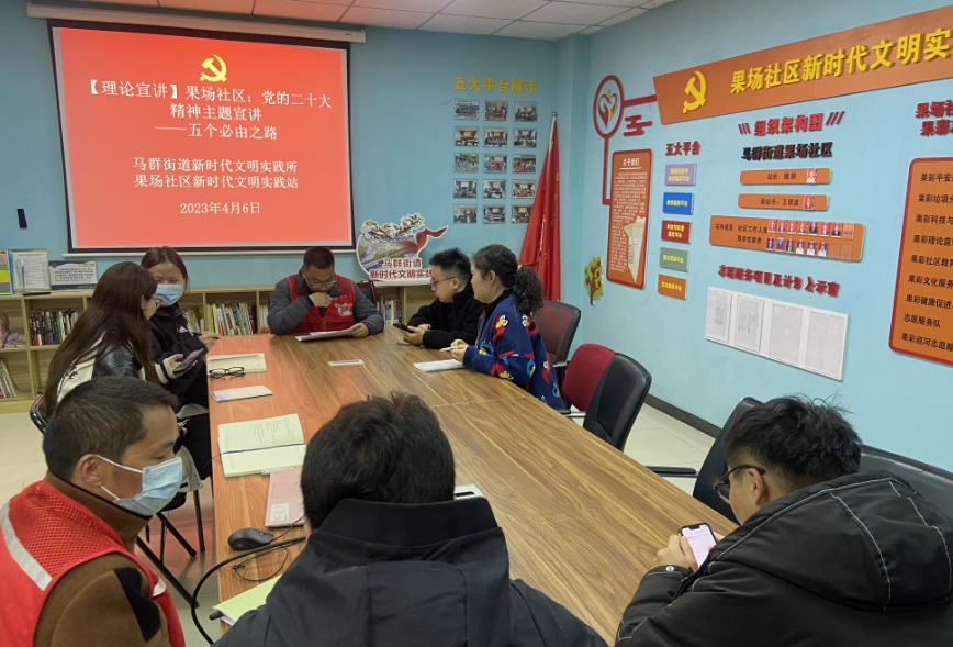 2023年4月6日下午,馬群街道新時(shí)代文明實(shí)踐所與果場(chǎng)社區(qū)新時(shí)代文明實(shí)踐站進(jìn)行站所聯(lián)動(dòng),依托理論宣講服務(wù)平臺(tái),在社區(qū)一樓實(shí)踐站文化陣地,組織社區(qū)黨員、新業(yè)態(tài)新就業(yè)群體黨員、民兵、退伍軍人、“齊益果”積分制志愿者開(kāi)展黨的二十大精神宣講。本次宣講人由社區(qū)黨員陶博擔(dān)當(dāng)志愿者,宣講內(nèi)容主要為“五個(gè)必由之路”。