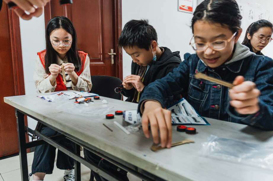 隨后,主講同學設計了“彈力小車”和“游泳健將”這兩個有趣的小實驗,讓小朋友們能夠更直觀地感受到彈力的作用效果。在做實驗的過程中,小朋友們認認真真地按照說明書上的步驟組裝小零件,并在志愿者的幫助下很快完成了彈力小車和游泳小人的制作。
