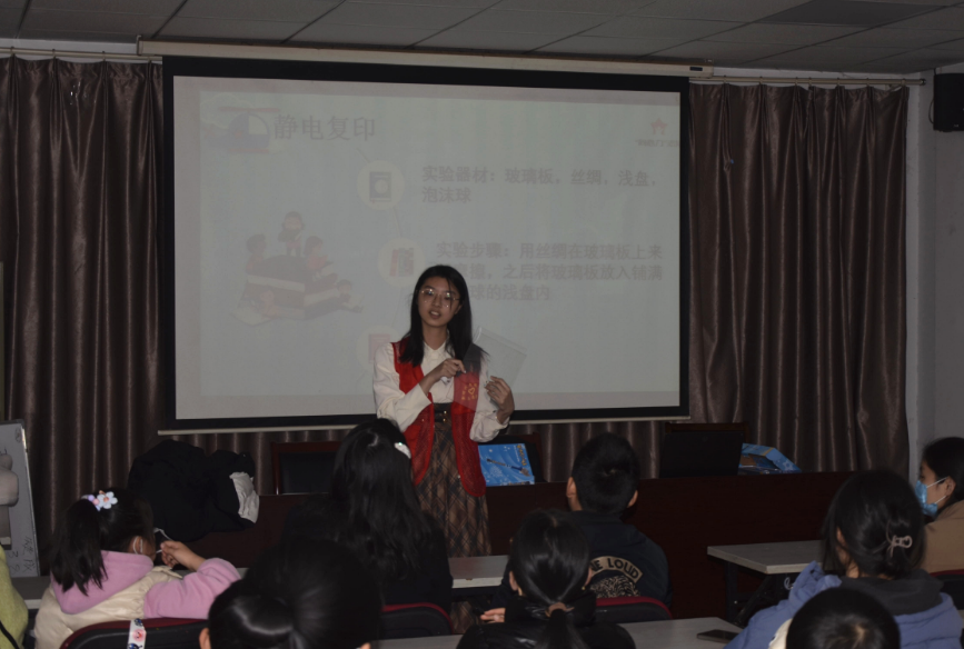 接下來由主講秦渃熹同學向小朋友們介紹靜電復印。秦渃熹同學向小朋友們提出復印機的原理是什么這一問題。在一番思索后,小朋友們表示并問題的答案,希望主講同學能夠為他們解答疑惑。于是秦渃熹同學取出絲綢,玻璃板,淺盤,泡沫小球等實驗器材,用絲綢在玻璃板上摩擦出“A”字型,蓋在淺盤的泡沫小球上,結(jié)果泡沫小球也呈“A”字型吸附在了玻璃板上。小朋友們瞪大了眼睛,對這一神奇的現(xiàn)象感到不可思議。在志愿者的協(xié)助下,每個小朋友都獲得了一份實驗器材,能夠自己動手實驗。在確保小朋友們都觀察到了實驗現(xiàn)象后,主講秦渃熹同學為小朋友們揭開了謎底:正是因為靜電能夠吸引輕小物體的特殊性質(zhì),所以絲綢摩擦過的玻璃板能夠吸引泡沫小球。小朋友們恍然大悟,紛紛表示了解到了新知識。最后,朱彥澄同學總結(jié)了本次活動,并帶領同學們了解了靜電在電子工業(yè),半導體行業(yè)與醫(yī)療領域如果應用不當都會產(chǎn)生危害。在生活中,我們可以通過勤洗手洗臉,增加空氣濕度等方法來預防靜電可能產(chǎn)生的危害。