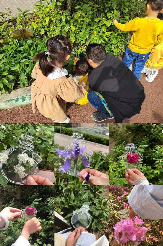 本次“定格春天”活動分為三個階段:尋春——捕捉春天的氣息,留春——制作壓花杯墊和書簽,惜春——合影留念。小朋友與大自然親密接觸,在各個園區(qū)拍攝當(dāng)下的春景,月季、鳶尾、繡線菊、杜鵑、玫瑰等被小朋友欣喜的“裝”進瓶子里。