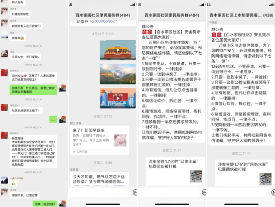 線上宣傳更廣泛 百水家園社區(qū)利用“掌上云社區(qū)”平臺發(fā)布國家安全教育日主題海報、闡釋有關國家安全的常識,轉發(fā)相關圖解、防范電信網絡詐騙海報20余次,普及群眾2000余人。當人身安全受到傷害時,居民也第一時間在掌云群內尋求幫助,工作人員及時詢問、迅速處理。同時,社區(qū)通過“掌上云”平臺呼吁大家一定要加強安全防范,保護好自身安全。