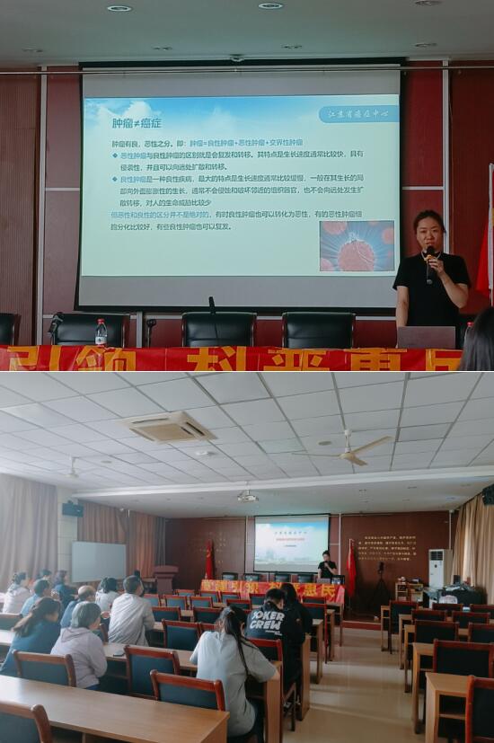本次宣講特邀請(qǐng)江蘇省腫瘤醫(yī)院放療科護(hù)士長(zhǎng)鄒美英及副主任醫(yī)師劉雅恬給居民開展知識(shí)講座,講座圍繞腫瘤流行病學(xué)概況、癌癥的一級(jí)預(yù)防、癌癥的二級(jí)預(yù)防等內(nèi)容,深入淺出地向居民們講解了癌癥的種類、發(fā)病的相關(guān)因素、表現(xiàn)、如何預(yù)防等,倡導(dǎo)居民養(yǎng)成良好的飲食習(xí)慣,通過健康的生活方式防癌抗癌,做到早預(yù)防、早發(fā)現(xiàn)、早診斷、早治療。