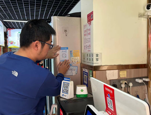 巡查過程中,社區(qū)工作人員對轄區(qū)內(nèi)餐飲商鋪油煙凈化設(shè)備使用情況進(jìn)行逐一檢查,檢查油煙凈化設(shè)備運(yùn)行情況外,還檢查商戶是否張貼了“碼上洗”二維碼,針對沒有張貼二維碼的商戶,要求商戶立即張貼,而對于已經(jīng)張貼的商戶,社區(qū)工作人員現(xiàn)場掃碼,查看商戶是否定期上傳清洗記錄。檢查結(jié)束后,社區(qū)工作人員叮囑商戶提高認(rèn)識、規(guī)范經(jīng)營,從源頭上控制餐飲油煙污染。