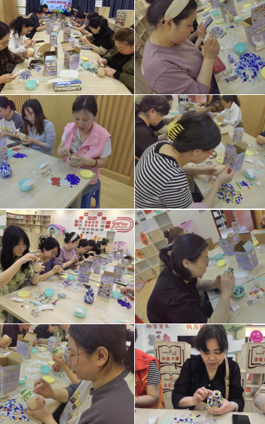 “我覺(jué)得這兩種綠色搭配起來(lái)有種春天的感覺(jué),很好看。”在制作過(guò)程,大家發(fā)揮自己的創(chuàng)造力和想象力,并時(shí)不時(shí)地相互交流,相互討論,最后將各種材料通過(guò)貼、刷、擦等動(dòng)作把馬賽克貼片塑造成一個(gè)個(gè)創(chuàng)意滿滿的花瓶,整個(gè)活動(dòng)現(xiàn)場(chǎng)充滿了歡樂(lè)的氣氛。