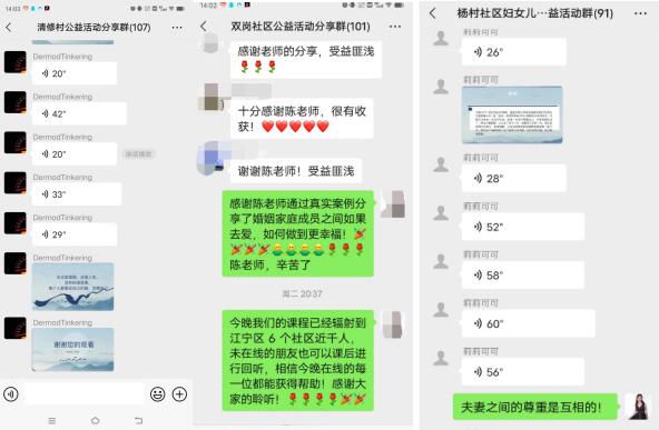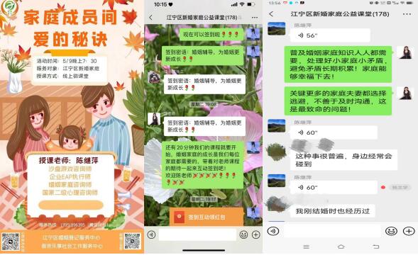 國家二級心理咨詢師陳繼萍老師用通俗易懂的話語、生動典型的案例,對婚姻家庭中如何加強(qiáng)夫妻間溝通、如何營造良好的婆媳關(guān)系、如何做好婚姻家庭親子之間的工作等方面進(jìn)行專業(yè)的解讀。在課堂中,陳老師引導(dǎo)新婚家庭認(rèn)真思考作為家庭成員該如何處理婚姻家庭的關(guān)系,鼓勵新婚夫婦踴躍發(fā)言,分享自己在進(jìn)入婚姻關(guān)系后處理婚姻家庭關(guān)系的經(jīng)驗(yàn)與做法。最后提出雙方需要做到有互補(bǔ)的概念、改變語言習(xí)慣、實(shí)現(xiàn)有效溝通、培養(yǎng)系統(tǒng)式的視角和表達(dá)。本次活動在線朋友認(rèn)為此活動對今后處理好婚姻家庭關(guān)系起到積極的促進(jìn)作用。