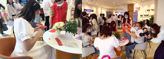 為增添高峰日的浪漫氣氛,在等候處精心布置了許多特色場景,希望新人可以通過各種特色場景體驗(yàn)到結(jié)婚領(lǐng)證這一高光時(shí)刻所帶來的莊重和浪漫。大型扭蛋機(jī)器和拍立得大立牌前多位新人駐足良久,以更適合年輕人花樣打卡的方式緩解新人在等待過程中的焦慮,除了前來登記結(jié)婚的新人外,也吸引了大量市民前來打卡。社工為在場的新人提供新婚輔導(dǎo)問卷,同時(shí)為他們發(fā)放剪紙工具,制作吉祥的紅色“囍”字,在小小的手工中培養(yǎng)大大的默契。