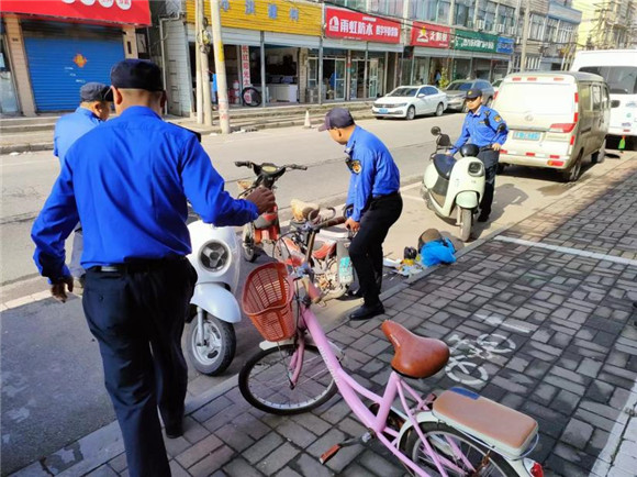 采取徒步巡查、機(jī)動(dòng)巡查、錯(cuò)時(shí)管理等方式,對(duì)轄區(qū)內(nèi)沿街門店占道經(jīng)營(yíng)、亂堆亂放、非機(jī)動(dòng)車亂停亂放、“牛皮廯”等進(jìn)行全面排查整治,督促沿街商戶嚴(yán)格遵守門前責(zé)任區(qū)規(guī)定,告知其嚴(yán)禁將物品擺放在人行道上,并對(duì)人行道上亂停亂放的非機(jī)動(dòng)車進(jìn)行整治,切實(shí)做到發(fā)現(xiàn)一處、糾正一處、整治一處。