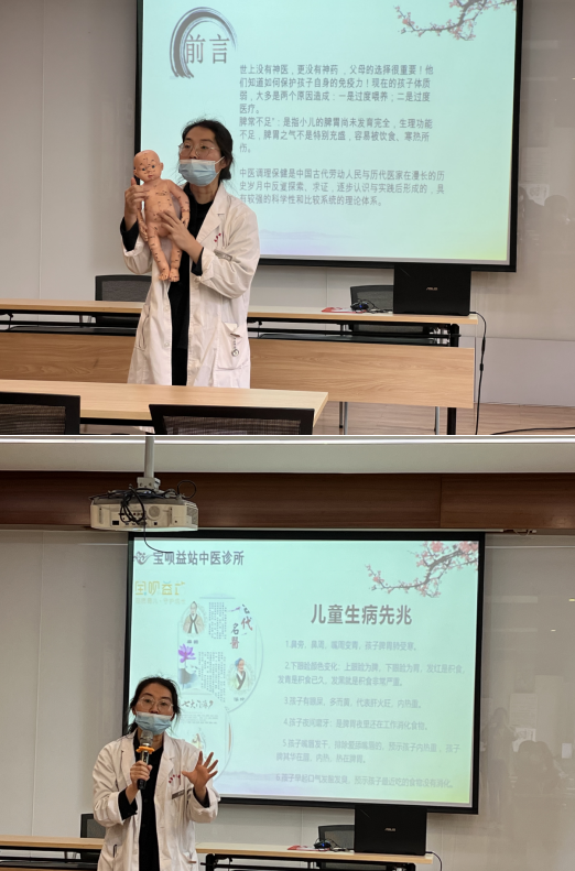 本次活動,邀請了寶唄益站中醫(yī)診所夏漠老師前來授課。講座現(xiàn)場,夏老師采用理論講解、PPT展示、真人示范等多種方式,用通俗易懂的語言為家長們講解了小兒推拿、小兒基礎(chǔ)按摩、小兒解決常見問題及常規(guī)調(diào)理等知識和各項步驟。同時,夏老師介紹了小兒推拿的常用守法,包括推、拿、揉、搓、捏等,并在現(xiàn)場給家長們示范如何正確快速找到穴位的方法。