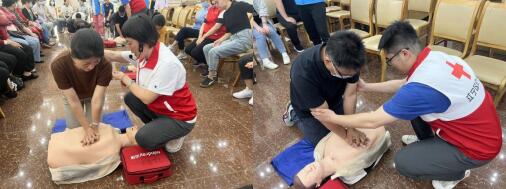 培訓中,張雍蓉老師以視頻教學、理論講授、現(xiàn)場演示、實踐操作等方式進行授課,向大家強調(diào)了應急救護“黃金四分鐘”的重要性,并逐一講解心肺復蘇技能、AED自動體外除顫器的操作使用和氣道梗阻的應急救護核心知識。在每一個重點知識講解并演練完畢后,張老師都會組織學員分組自由練習,加固技能掌握,力爭做到動作標準、到位。