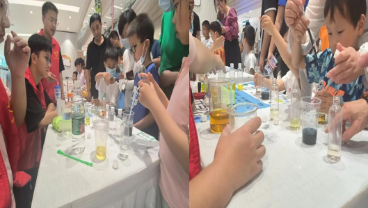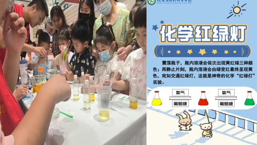 瓶內(nèi)溶液會由綠變紅最終呈現(xiàn)黃色,宛如交通紅綠燈。看到顏色變化的時候,少年兒童們都瞪大了雙眼,驚嘆道:“好像馬路上那個交通信號燈的顏色呀!”