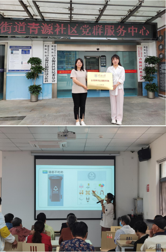 會(huì)上,雙方書(shū)記各自介紹了河海大學(xué)公共管理學(xué)院、青源社區(qū)的基本情況及黨建引領(lǐng)基層治理情況,闡述各自優(yōu)勢(shì)與資源、需求,隨后雙方進(jìn)行簽約,并舉行掛牌儀式。最后,河海大學(xué)公共管理學(xué)院的2名團(tuán)員志愿者,來(lái)到青源社區(qū)居家養(yǎng)老活動(dòng)中心,為青源社區(qū)的老年人開(kāi)展了一場(chǎng)垃圾分類知識(shí)分享會(huì)。