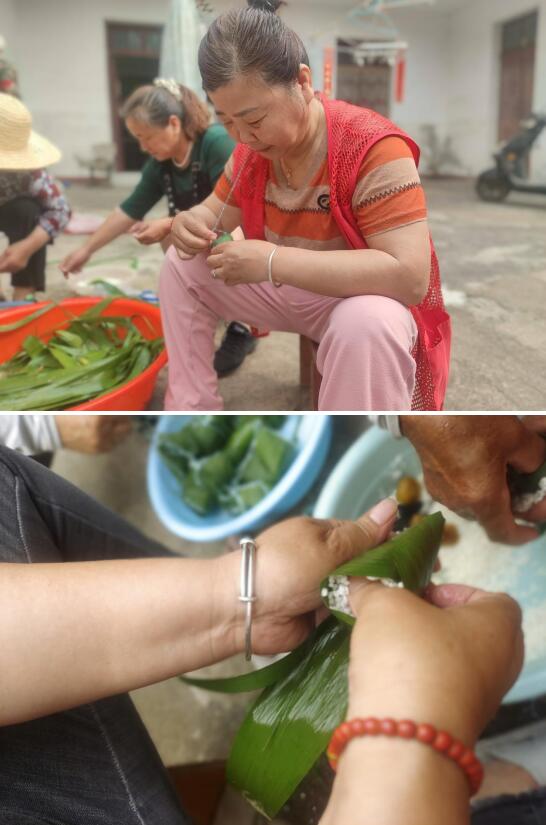 隨后,大家一起動手準(zhǔn)備糯米、粽葉、蜜棗等材料,將粽葉填滿糯米、夾入蜜棗,然后用粽繩系好,大家一邊包著粽子,一邊懷念以前的勞作時光,感慨現(xiàn)在的幸福生活。在王奶奶和周奶奶的引領(lǐng)下,大家一起唱起當(dāng)年集體勞動時的插秧歌,熱情高漲。不一會兒,一個個結(jié)實飽滿的粽子就擺滿了臉盆?;顒蝇F(xiàn)場氣氛歡快,笑聲不斷。