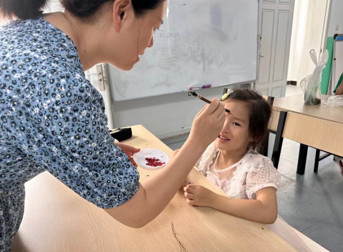“端午節(jié)是我國的傳統(tǒng)文化節(jié)日……”現(xiàn)場,志愿者以生動幽默的語言講述了端午節(jié)的傳統(tǒng)習(xí)俗。點朱砂、系五彩繩蘊含著對孩子們身體健康、安安全全的美好祝福。在志愿者的引導(dǎo)下,青少年們有序排起長隊,期待著志愿者在自己的額頭點上朱砂,手腕上系上五彩繩。
