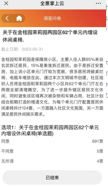 近日,金陵驛社區(qū)通過“掌上云”平臺投票系統(tǒng)針對增設休閑桌椅事項征求轄區(qū)居民意見,此項舉動在“掌上云”小程序里得到了居民的大力支持。“線上議事真的是太方便我們居民了,以前張貼告示有什么意見還需要再去社區(qū),現(xiàn)在手機上就能操作了。”老黨員田師傅激動地說。