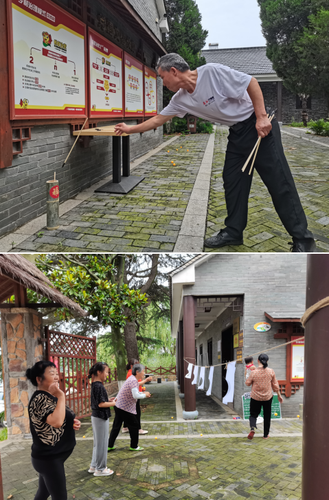 活動開始前,社工給大家介紹了端午節(jié)的由來與風俗,讓大家了解并體驗端午節(jié)民俗趣味游戲投壺、射五毒、包粽子。投壺是中國古代士大夫宴飲時做的一種投擲游戲,也是一種禮儀?;顒娱_始時,工作人員給村民講解投壺的相關(guān)知識以及游戲玩法,在拿到木箭后村民們躍躍欲試,在投擲中,村民用心、專注,均投擲出不錯的成績。