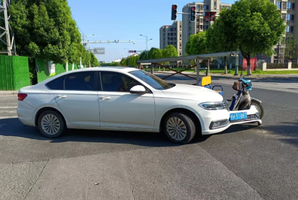 據(jù)悉,事故系一輛白色轎車和一輛電動三輪車在一個十字路口相撞,經(jīng)交管部門初步判定,是電動三輪車在該十字路口闖紅燈,而白色轎車避讓不及,導致兩車相撞,但好在車速不快,事故未造成人員傷亡,僅汽車車身有一些擦刮,汽車前車牌被撞壞。