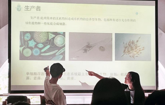 海洋生態(tài)系統(tǒng)是全球最重要的生態(tài)系統(tǒng),人類的生存和發(fā)展與海洋息息相關(guān)。在海洋生態(tài)科普上,曾雪鈺首先用動(dòng)畫引出了海洋生態(tài)系統(tǒng)的概念,然后著重介紹了海洋生態(tài)系統(tǒng)的生物成分和非生物成分。在曾雪鈺同學(xué)的引導(dǎo)下,小朋友們認(rèn)識(shí)了許多微小精妙的浮游植物,在一輪輪問答中,小朋友們了解了不少海洋動(dòng)物之“最”,也展示了自己豐富的知識(shí)儲(chǔ)備和較高的海洋素養(yǎng)。明明一身綠,為什么被稱為“紅樹林”?海藻場(chǎng)有什么作用?珊瑚蟲和珊瑚是什么關(guān)系?在解決一個(gè)又一個(gè)問題的過程中,小朋友們認(rèn)識(shí)到海洋生態(tài)系統(tǒng)的多樣性與重要性,并與老師一起探討海洋生態(tài)系統(tǒng)面臨的問題與解決之道。