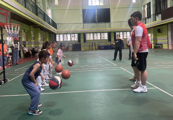 在陣陣籃球觸地的律動中,不少未成年人在志愿者的教學中漸漸變得熟練,有模有樣。接著,大家進行了投籃訓練?;@球架是可升降的,也是為適應不同年齡段未成年人們的需要??粗蠹以诨@球入網時的滿臉笑容,能夠直觀感受到大家對本次課堂內容的喜愛。