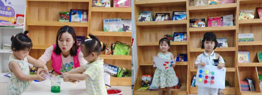 “最好的朋友小藍(lán)和小黃共同經(jīng)歷了一次神奇的冒險(xiǎn)。他們抱在了一起,直到變成了綠。可是,小藍(lán)和小黃到哪里去了呢?他們消失了嗎?”在老師的啟發(fā)式提問下,小朋友們漸漸沉浸在閱讀當(dāng)中,通過閱讀感受顏色,認(rèn)識顏色,初步了解調(diào)色相關(guān)知識。閱讀過后,老師利用顏料和彩色黏土讓小朋友們動(dòng)手體驗(yàn)色彩變化,進(jìn)一步鍛煉自己的動(dòng)手能力和思考能力。