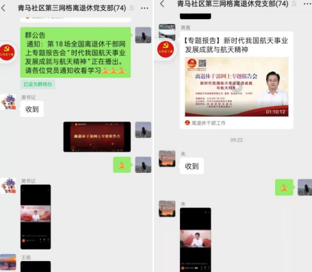 一個(gè)多小時(shí)的視頻學(xué)習(xí),老同志們不僅深入了解了新時(shí)代我國(guó)航天事業(yè)發(fā)展成就,學(xué)習(xí)了自力更生、勇于挑戰(zhàn)的航天精神,更增強(qiáng)了他們發(fā)揮余熱、奮發(fā)圖強(qiáng)的理想信念。在現(xiàn)場(chǎng)的黨員踴躍發(fā)言,分享自己的觀看心得,未能到場(chǎng)的黨員也在“掌云”微信群中發(fā)表了自己的心得體會(huì)。