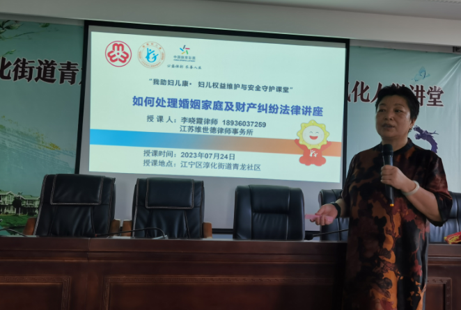 為讓法律走進(jìn)尋常人家,科學(xué)普法在當(dāng)今社會顯得尤為重要。7月24日下午,南京市江寧區(qū)淳化街道青龍社區(qū)邀請江蘇維世德律師事務(wù)所李曉霞律師,為社區(qū)內(nèi)居民開展“我助婦兒康·婦兒權(quán)益維護(hù)與安全守護(hù)課堂”講座,讓居民知曉如何處理婚姻家庭及財產(chǎn)糾紛。