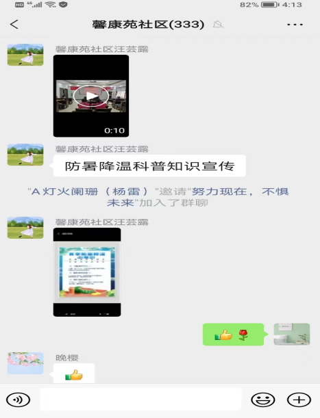“趁“熱”,這份防暑降溫指南請(qǐng)查收.......”居民群內(nèi),社區(qū)工作人員通過友情提醒、鏈接推送、圖文科普、視頻宣教、互動(dòng)分享等形式為居民們普及了熱射病相關(guān)知識(shí)以及使用的防暑知識(shí),提醒居民防暑重在預(yù)防,要避免在日照強(qiáng)烈的時(shí)間段劇烈運(yùn)動(dòng);外出要做好防護(hù),盡量走在陰涼處;多喝水補(bǔ)充有機(jī)鹽分;居家空調(diào)溫度不宜太低;家中可常備仁丹、藿香正氣水等防暑藥品;如高溫引發(fā)身體不適,應(yīng)及時(shí)就診治療。“夏季莫貪涼,謹(jǐn)防空調(diào)病”、“我家就經(jīng)常熬些綠豆湯”、“冰鎮(zhèn)食品注意少吃”、“外出可隨身攜帶清涼油、藿香正氣等防暑藥品”、“西紅柿、絲瓜、苦瓜也是不錯(cuò)的選擇”......居民們紛紛分享道。