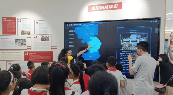 其次,在法院工作者小姐姐的帶領(lǐng)下,大家依次參觀了大廳、云展館、導(dǎo)訴臺和歷史陳列館等。通過對大量的圖片、文字、實(shí)物以及多媒體的介紹,工作人員生動形象地展示了法院的歷史沿革、組織架構(gòu)、審判流程等方面的內(nèi)容。同學(xué)們都聆聽、觀察得十分仔細(xì),還時而提問交流,并在攝影區(qū)域紛紛拍照留念。