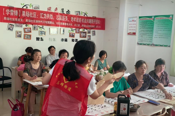 南京市棲霞區(qū)馬群街道果場社區(qū)整合轄區(qū)教育資源,匯力開展學(xué)雷鋒主題志愿活動。2023年8月2日,果場社區(qū)黨委、社區(qū)關(guān)工委、社區(qū)居民學(xué)校、南京萊臻老年大學(xué)依托社區(qū)新時代文明實踐站,以社區(qū)書法興趣愛好者、書法教學(xué)工作者加入“齊益果”積分制志愿隊伍,組織社區(qū)老年居民在社區(qū)綜合文化服務(wù)中心開展“匯力共助、志愿服務(wù),老年居民書法興趣班開班啦”志愿服務(wù)活動。