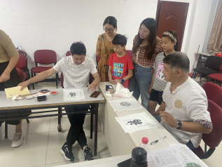 在未成年人們完成自己的拓畫設計后,來自省書協(xié)的張老師還自帶了印章給大家的作品進行現場題跋。大家看著自己的名字和設計語言被張老師寫在作品上,也是十分開心,覺得像是在見證古代文人如何進行作品賞鑒一樣,無形中又學到了許多相關的知識。