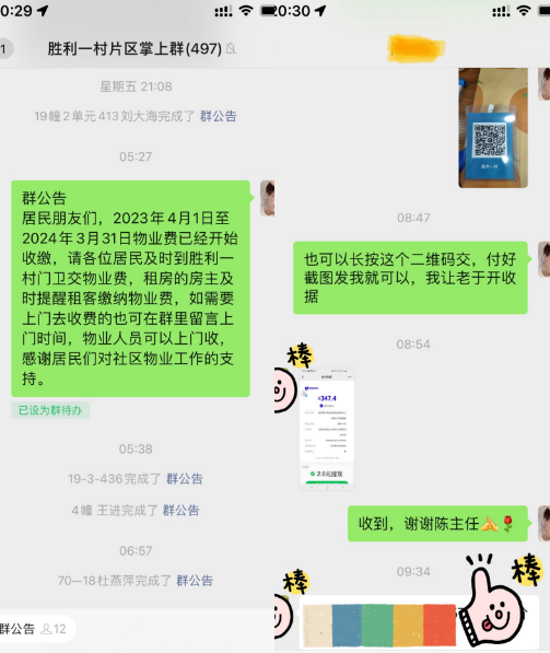 活動前夕,社區(qū)工作人員開展了一次有關(guān)物業(yè)費(fèi)收繳的推進(jìn)會,會議決定通過掌上云社區(qū)平臺,在社區(qū)微信群中進(jìn)行統(tǒng)一通知,居民可以選擇去線下小區(qū)門衛(wèi)處繳費(fèi),也可以選擇在線上掃碼支付,不方便線下的居民還可以選擇物業(yè)上門收繳的服務(wù)。這樣一來,不僅節(jié)省了居民的寶貴時間,也提高了繳費(fèi)效率。