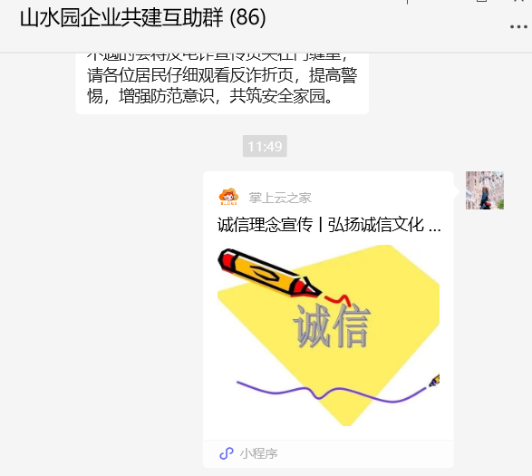 為深入推進(jìn)誠(chéng)信建設(shè)宣傳,營(yíng)造全社會(huì)誠(chéng)實(shí)守信、重信守諾的文明風(fēng)尚,8月起,山水園社區(qū)開(kāi)展誠(chéng)信建設(shè)萬(wàn)里行掌上云宣傳活動(dòng),依托云社區(qū)平臺(tái),發(fā)布誠(chéng)信學(xué)習(xí)鏈接,開(kāi)展線上誠(chéng)信宣講活動(dòng),引導(dǎo)居民樹(shù)立誠(chéng)實(shí)守信價(jià)值觀,讓誠(chéng)信宣傳走進(jìn)千家萬(wàn)戶(hù)。人無(wú)信不立,業(yè)無(wú)信不興,此次宣講受眾人群包括社區(qū)居民、青少年、個(gè)體企業(yè)經(jīng)營(yíng)者,累計(jì)推送誠(chéng)信宣傳20余次,讓大家充分認(rèn)識(shí)到誠(chéng)信是社會(huì)主義核心價(jià)值觀的重要內(nèi)容,建設(shè)社會(huì)信用體系離不開(kāi)誠(chéng)信建設(shè),同時(shí)在掌上云社區(qū)設(shè)置誠(chéng)信宣傳知識(shí)競(jìng)答,進(jìn)一步加大宣傳效果,讓居民在潛移默化中了解誠(chéng)信建設(shè)的重要性,營(yíng)造“知信、守信、用信”的良好社會(huì)環(huán)境。