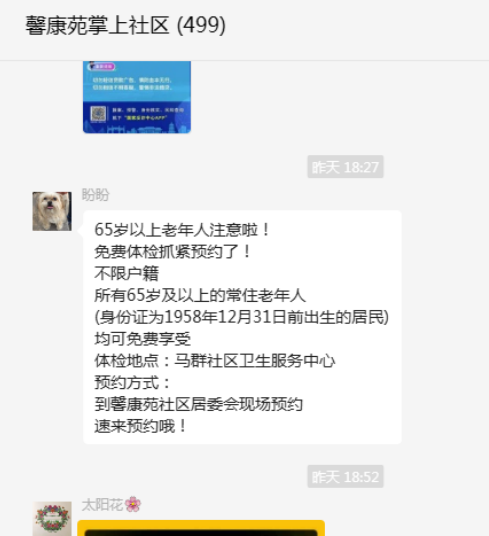 “我年年都會參加這個健康體檢,也是對自己負責”、“現(xiàn)在的助老政策真是越來越好”、“我家老人還沒參與,報個名,這個周六帶他過去”......群內(nèi),居民們紛紛回應(yīng)道。